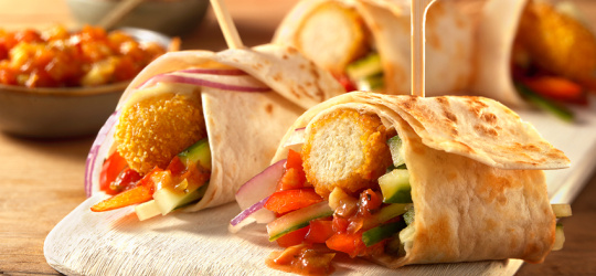 Een tortilla wrap met Mora vegetarische Kipkorn®, rode paprika reepjes, komkommer reepjes, rode uien ringen, vegan mayonaise en tomaten salsa.